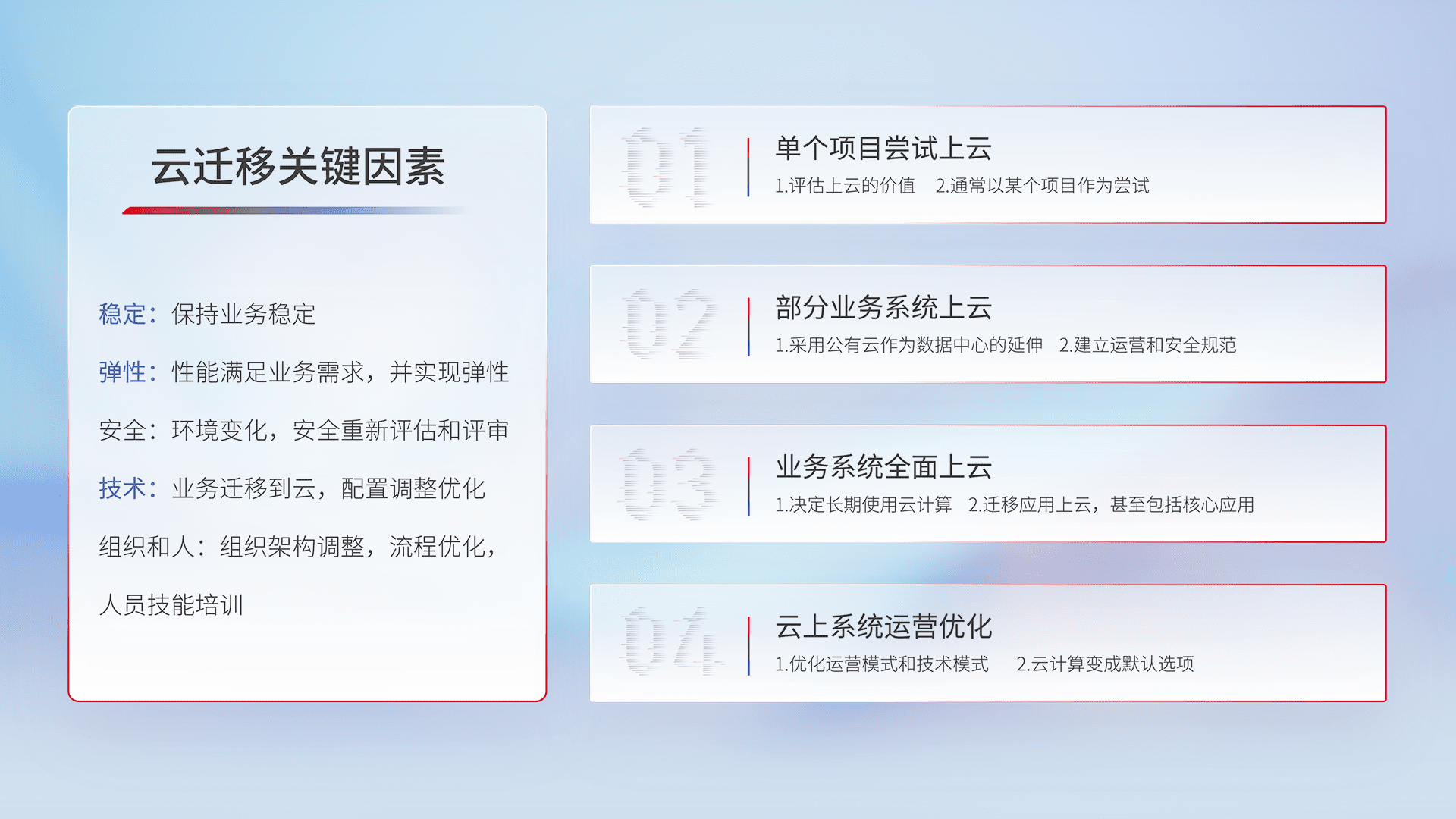 结合实际业务,,,,从规划设计、、云平台选型、、、云原生改造、、数据迁移、、集成交付,,迁移全过程为客户识别最佳上云路径,,,,做好风险识别管理,,,设计网络架构、、身份权限、、、安全审计合规、、、操作审计、、、日志审计、、、、监控告警策略、、、多站点容灾设计等,,对云上基础设施进行整体规划,,,,提升IT治理水平,,以满足弹性、、、、高可用、、、高性能的需求。。。。
