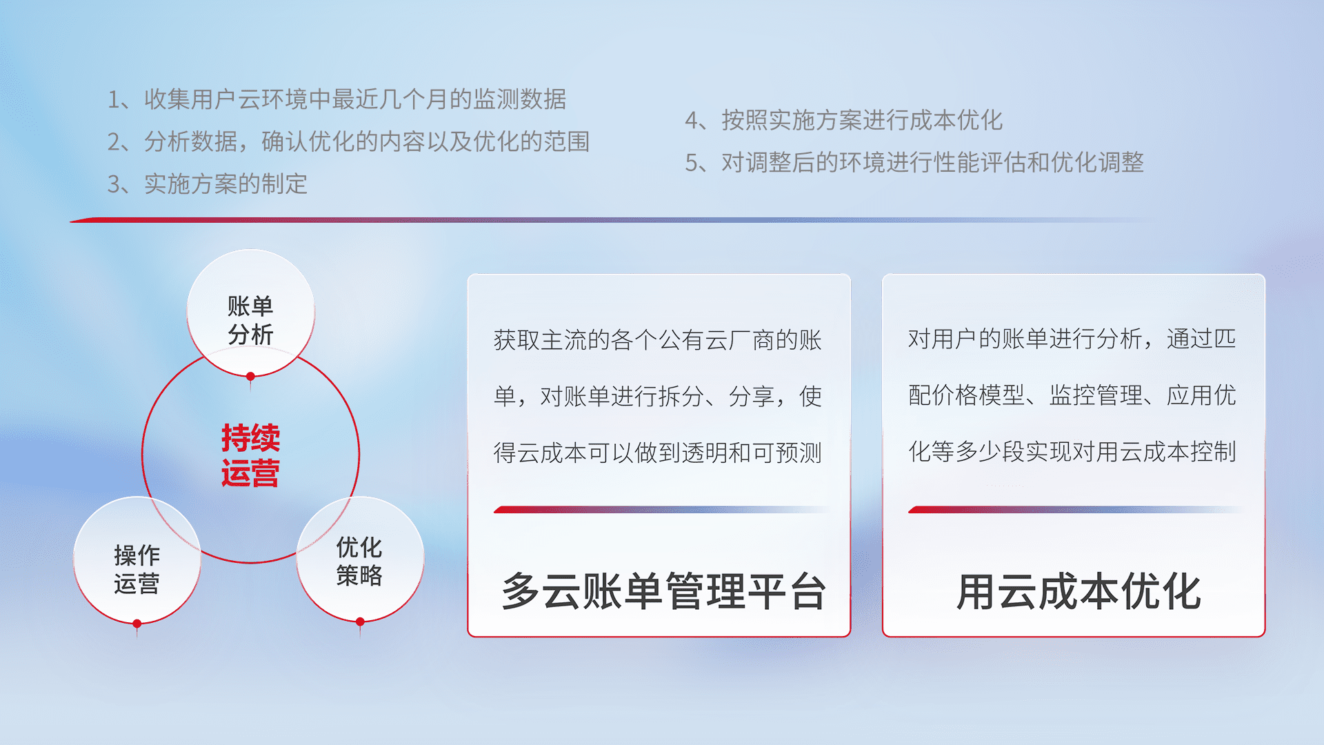 通过多云纳管,,,以统一的资源数据模型把客户的云资源进行抽象和封装,,进而实现对多云资源的统一操作,,,保障云资源管理的可靠性、、、、稳定性与可用性。。。。量身定制化运维内容,,,,配置、、开发运维、、补丁管理、、备份、、监控、、、认证和访问管理、、、、审计和日常巡检等,,,保障在用云过程中的可靠度,,,,稳定度以及高可用率。。