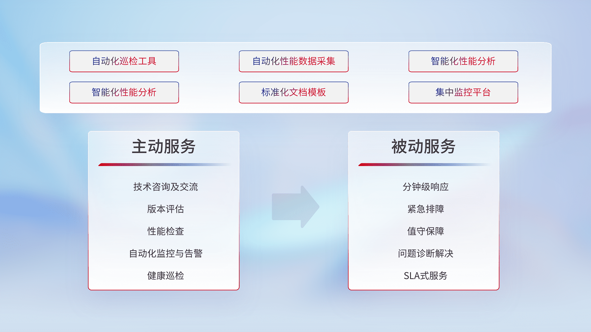 智能化工具和标准化文档,,保障服务质量,,,,提供主动服务(包含技术咨询、、、版本评估、、、、性能检查、、、自动化监控与告警、、健康巡检)和被动服务包含(分钟级响应、、紧急排障、、、、值守保障、、问题诊断解决、、SLA服务)。。。。