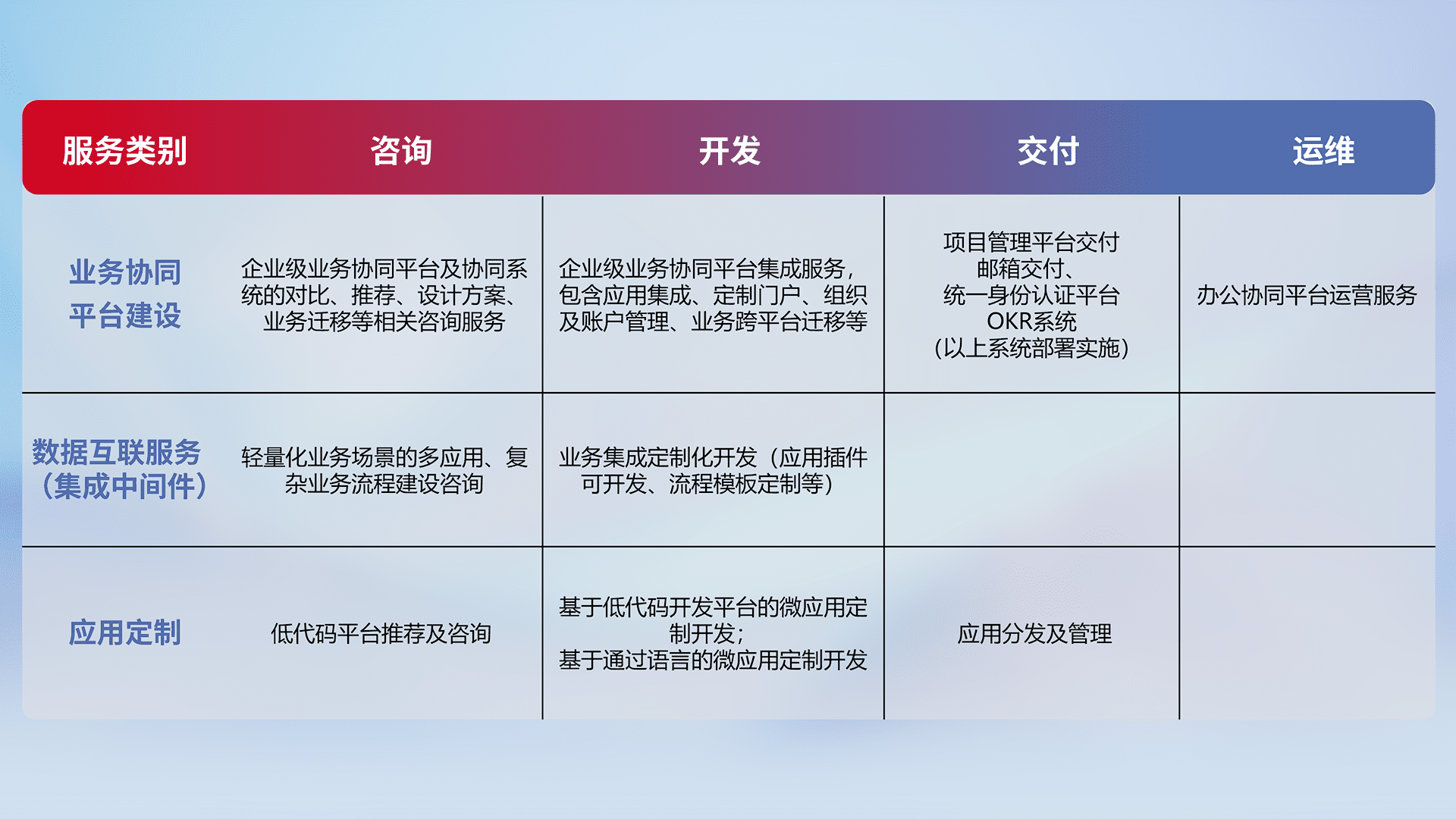 针对钉钉、、、、企微、、、IDaas等平台级产品提供产品的规划、、方案、、、交付、、、定制化开发等服务,,,实现如统一协同办公、、智能客户服务、、、混合会议管理、、智能数据查询、、等业务场景,,,实现数字化转型。。。。